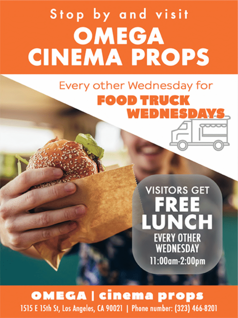 Advertisement for Omega Cinema Props’ Food Truck Wednesdays created for a film industry newsletter to encourage potential customers to visit. Specific food brands and images of existing food trucks could not be used, so other imagery had to be employed to entice new customers.